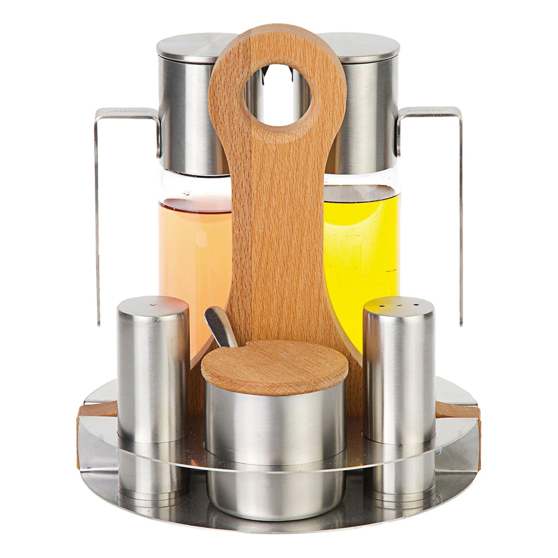 • Stainless steel stand with wooden handle.