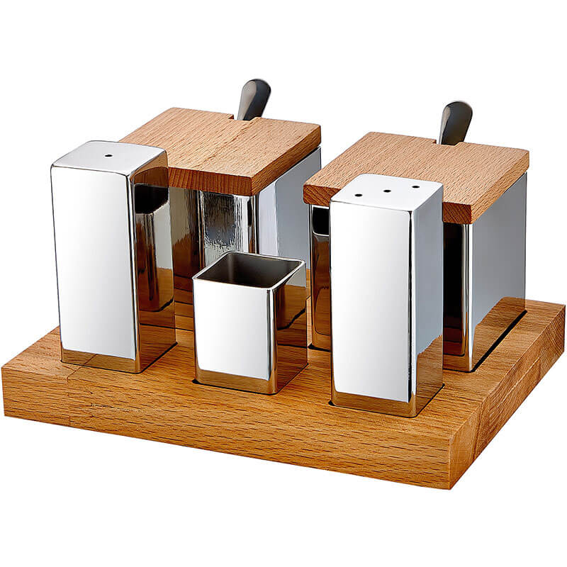 Groovy Wooden Stand, 5-Piece Salt and Spice Set, Square, Glossy-Matte