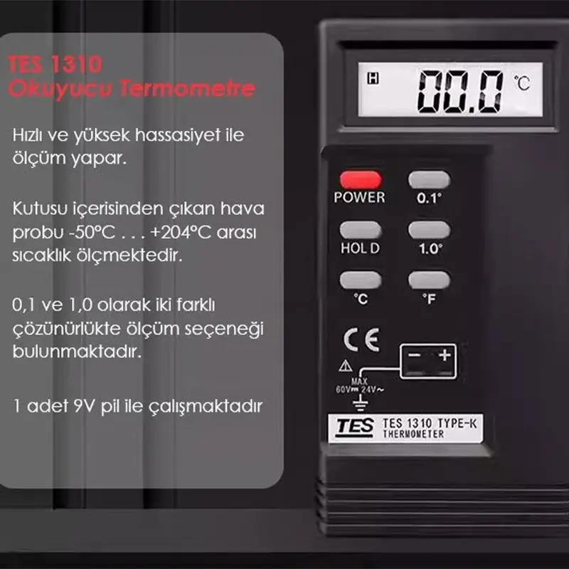 TES 1310 okuyucu termometre; yüksek hassasiyette ölçüm yapar, bu özellik de hassas ölçüm gerektiren işlerde bu cihazı öne çıkarmaktadır.