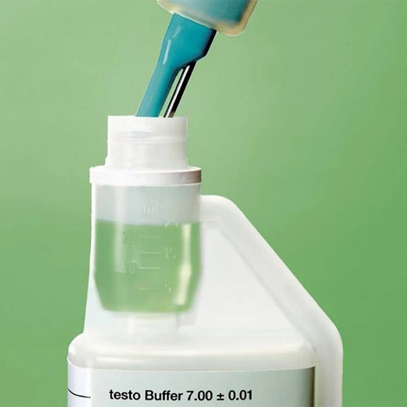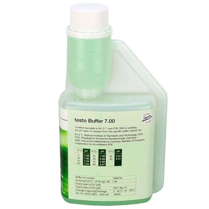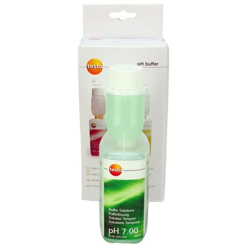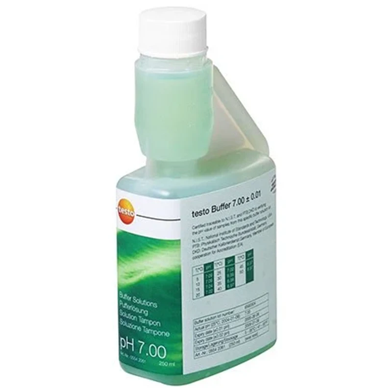 Testo 0554 2063 code pH calibration liquid is a buffer solution with a pH value of 7.00 in a practical dosing bottle.