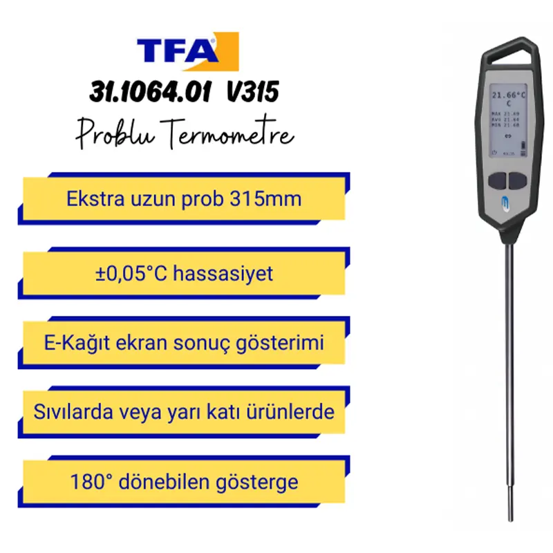 TFA 31.1064.01 V315 problu termometre, -50 derece ile +250 derece arasında geniş bir ölçüm aralığına sahip olması ve yüksek hassasiyetiyle kimya, ilaç ve gıda endüstrilerinde, ayrıca kalite kontrol laboratuvarlarında vazgeçilmez bir araçtır.