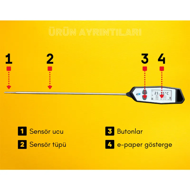 Bu problu termometre, son derece hassas ölçüm kabiliyeti, hafif ve kullanışlı yapısıyla öne çıkar. Sıvılarda, hava ölçümünde veya yarı katı malzemelerde sıcaklık ölçümü için idealdir.