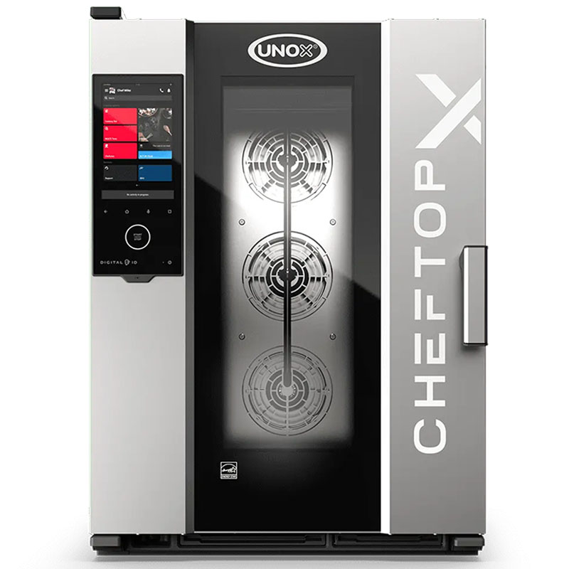 Notify me when its in stockA professional high-performance combi oven designed to perfectly execute the baking process for all types of gastronomy, pastries, and dough-based products, equipped with the latest operating system and smart technology. Thanks to the recirculating automatic washing system, it is ENERGY STAR® certified for low consumption performance and waste reduction. CHEFTOP-X™ features a cooking chamber molded from 316L steel and an integrated RO.Care water filtration system that eliminates the need for external treatment. It is equipped with an integrated microphone for voice control and interaction with UNOX Corporate Chefs to receive direct cooking assistance via the interactive panel. The advanced Digital.ID™ operating system allows users to save all their favorite settings in their account and transfer them from one oven to another within seconds. With the Digital.ID™ app, the oven can be controlled from smartphones and accounts can be customized.