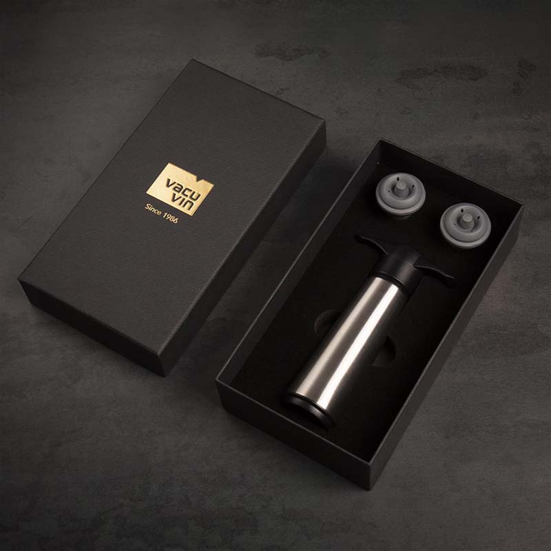 - The stylish and durable design of the Vacu Vin Wine Vacuum Set, Stainless Steel (1 Pump, 2 Stoppers), Gift Boxed, is a perfect accessory to keep your wines fresh.