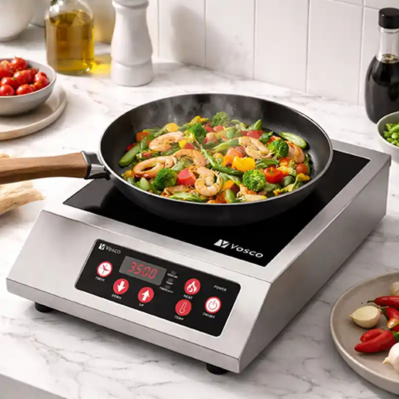 Vosco VALP-A83 Tekli İndüksiyon Ocak, yüksek performanslı 3500W indüksiyon sistemi sayesinde hızlı ısınma, enerji verimliliği ve güvenli kullanım sunar. Dayanıklı gövdesi ve kompakt masaüstü tasarımı ile hem yoğun mutfak kullanımı hem de ev mutfaklarında pratik bir pişirme çözümü sağlar.