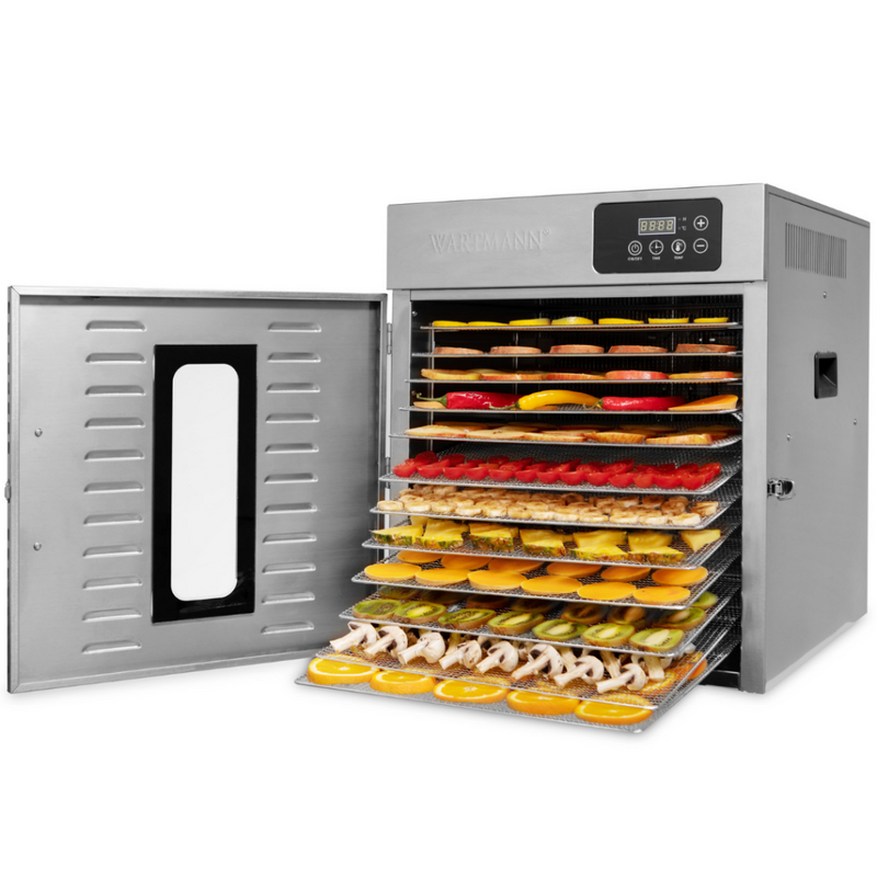 12 adet paslanmaz çelik tepsi bulundurarak geniş kurutma alanı vadeder.Tek seferde ortalama 10 kilogram meyve sebze kurutmak mümkün olur. Geniş alanda meyve ve sebze kurutabilir, kraker, pestil gibi gıdalar hazırlayabilir, sebze cipslerinin ve kışlık kuruların keyfini sürebilirsiniz. Üstelik cihaz, düşük sıcaklıkta maksimum besin koruması ile kurutma yapabilir. Arzu ederseniz Raw gıda standartlarında kurutma gerçekleştirmeniz de mümkündür. 25 santigrat derecelik başlangıç derecesi ile kendi alanında nadir bulunan bir özelliğe de ev sahipliği yapar.